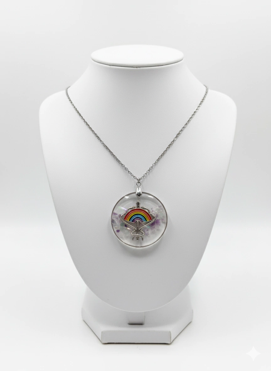 Este pingente é a manifestação viva da energia de Oxumarê, o orixá que governa o movimento, a renovação e o equilíbrio entre céu e terra. Feito em resina transparente, ele revela a beleza natural das pedras de fluorita, que trazem clareza mental, proteção espiritual e harmonia interior.